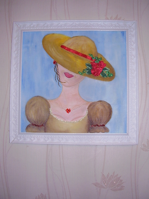 Работа творческая Девушка-загадка выполнена акриловыми красками на х\б ткани. Потом цветы на шляпе, листья и оборка (типо тесьмы) (вобщем не знаю как назвать) - вышивка лентами. Цепочка- вышивка золотой нитью. Цветок на цепочке - объёмная вышивка бисером. Работу выполняла буквально ночью этой весной, чтобы попала на городскую выставку. И она всё же не прошла на город. Может потому что глаза не нарисованы? Но это специально было задуманно! Я человека впервые в жизни рисовала - это для меня был большой шаг вперёд! Тем более что на ткани!